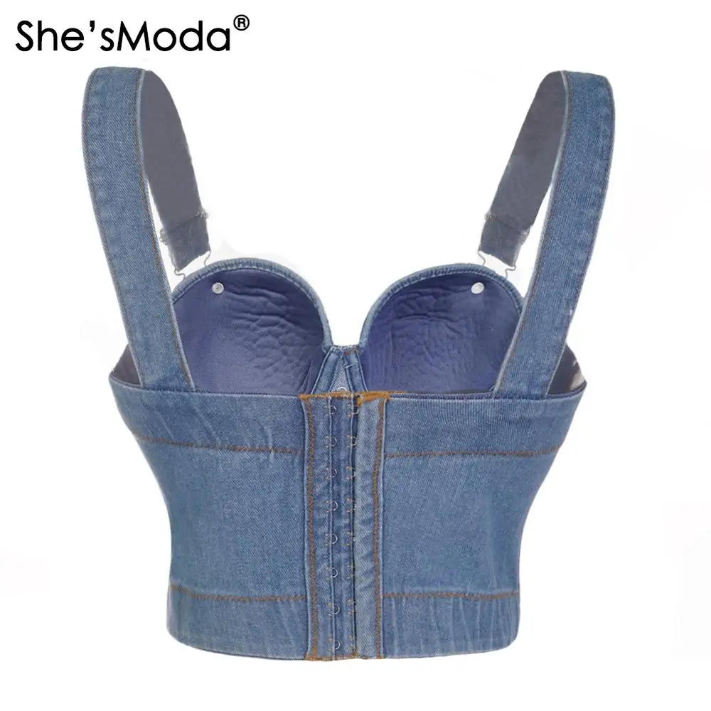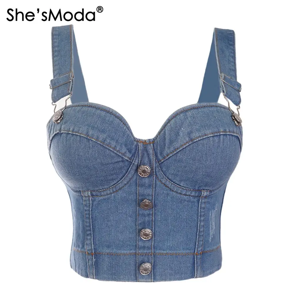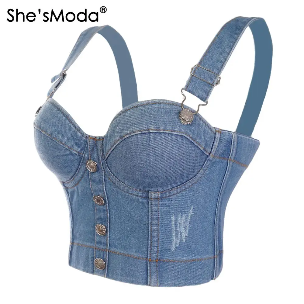 BEST SELLER She'sModa Denim Jeans Women's Button Bustier Bra Night Club Party Cropped Top Vest Plus Size